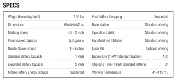 • 6 gallon paint container, the largest capacity than any other robot. Powered with high capacity and easily interchangeable / rechargeable batteries.