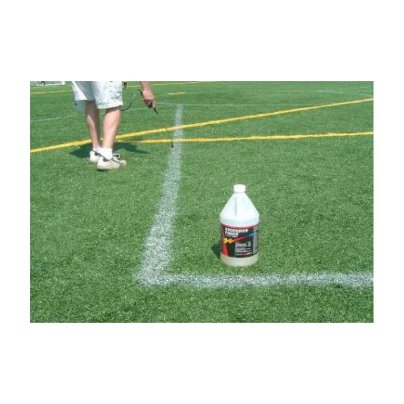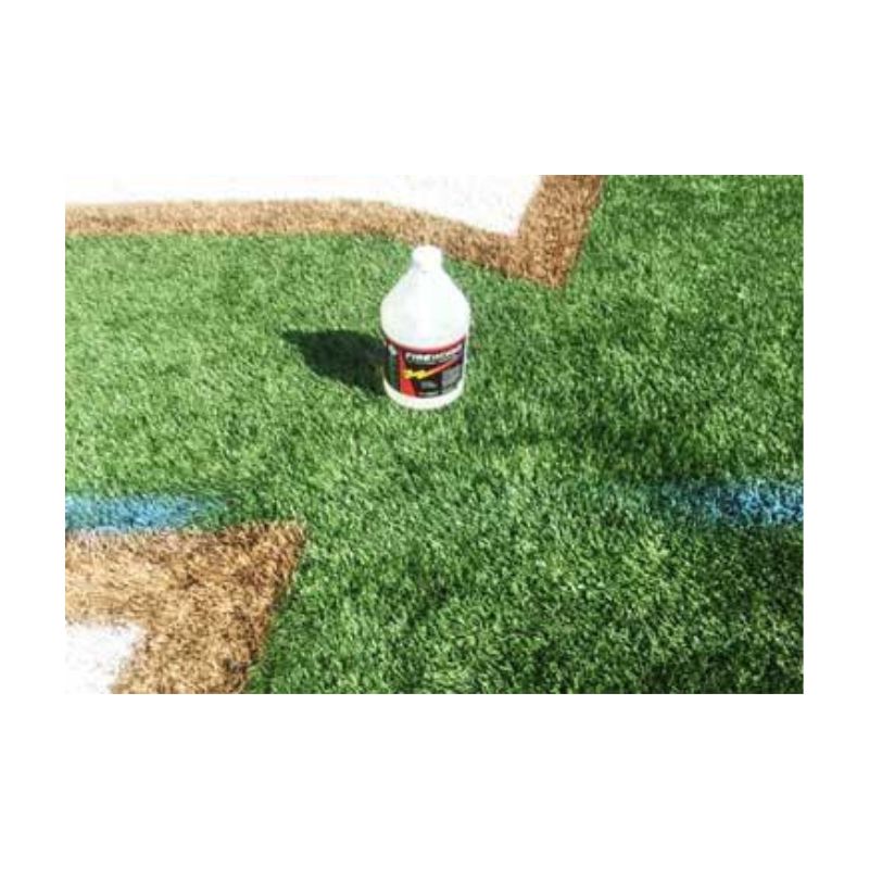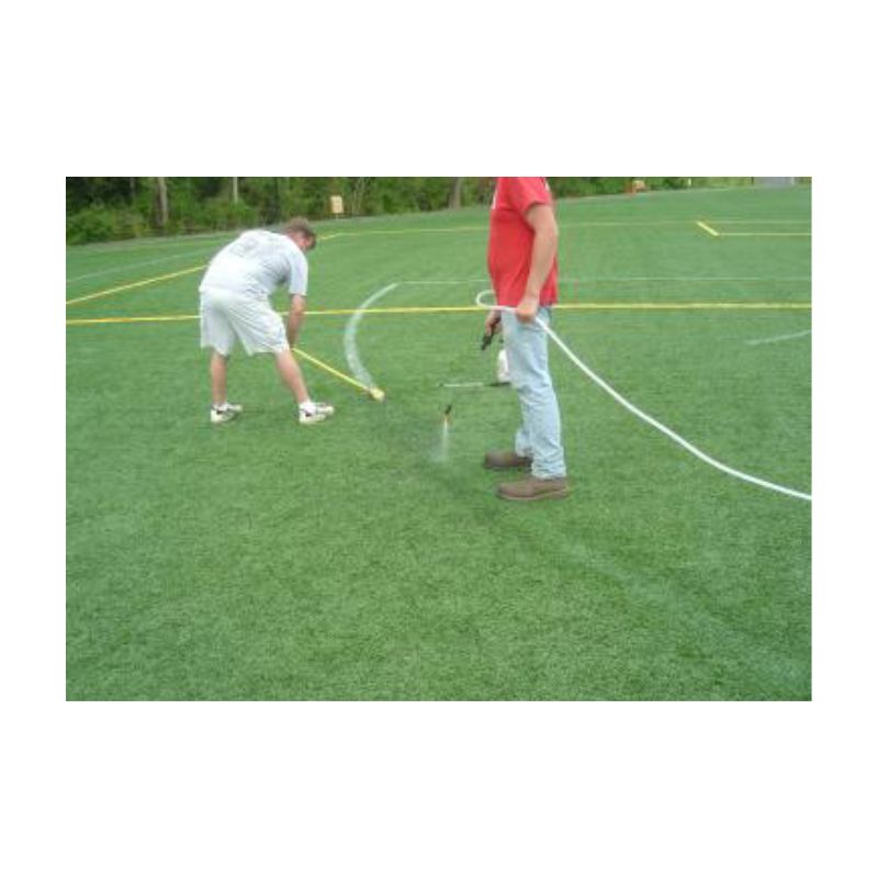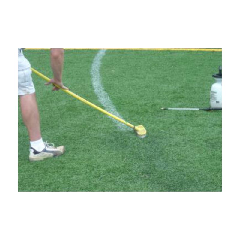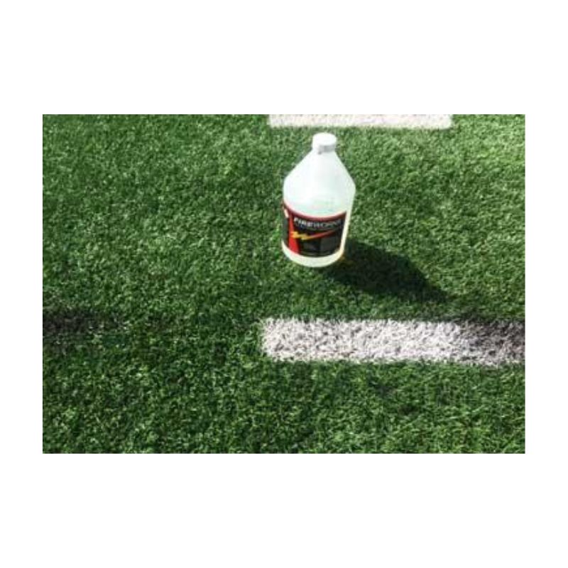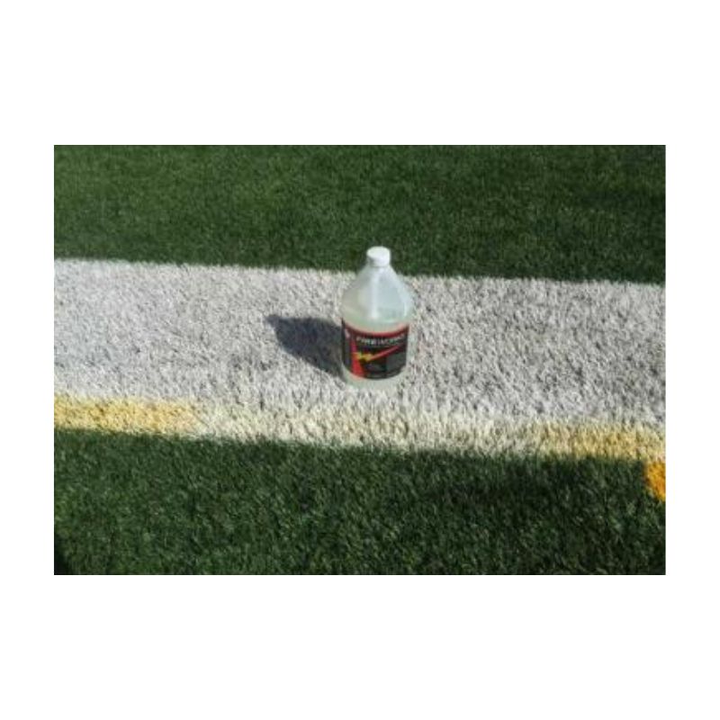 Formulated and manufactured by USSC, this water-based formula is designed to remove unwanted, old paint lines from synthetic artificial field turf. It will not hurt or damage the synthetic turf filaments or the rubber and sand infield filler. As with any chemical please wear protective gear to prevent getting the product or the product splatter on skin or eyes. Wear protective gloves, safety eyes glasses and appropriate shoes when applying or scrubbing the paint with this product. PAINTOFF remover can be used without dilution for maximum strength or can be diluted with 1 to 2 parts of water. Simply pour or spray the remover on the paint that needs to be removed. Let it soak for a few minutes to penetrate and start loosing up the paint. Then apply slight agitation to speed removal. Before the remover paint mixture dries, rinse and flush with water. The unwanted paint should be removed with one good application. For tough, hard to remove paints a second application, scrubbing and rinsing might be necessary.