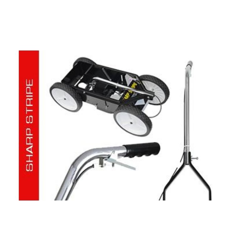 Compact, sturdy machine to stripe, mark, line, paint, spray aerosol paint cans. Stripe traffic lines on parking lots, warehouses, lines on synthetic turf fields, baseball field sidelines.