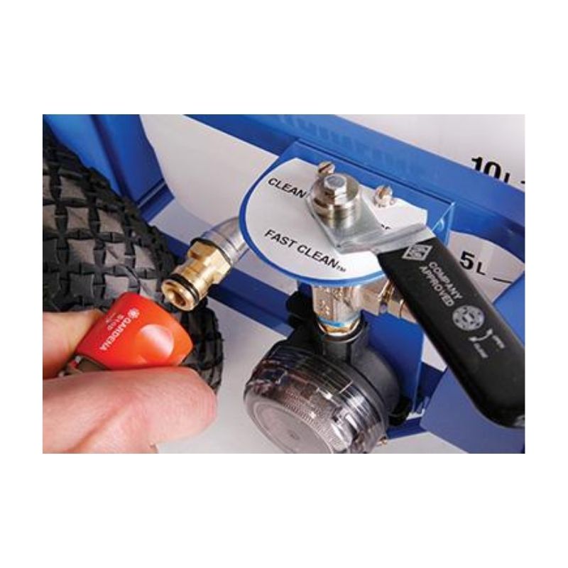 - Specially designed 6 gallon paint container capacity. Easily change containers for color change using the quick disconnect fitting.